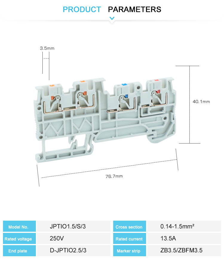 PTIO1.5/S/3 Bloque terminal El bloque Terminal adopta nylon-retardante de llama PA66, conductor de latón y resorte de compresión de acero inoxidable para garantizar la seguridad eléctrica y la resistencia mecánica en condiciones de trabajo duras.